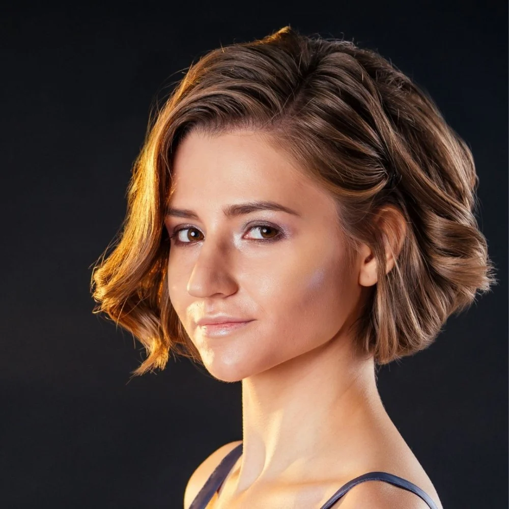 شعر ناعم ومصفف (ليس قصيرًا) باستخدام الاستشوار والمكواة، يفضل استخدام أجهزة بقوة عالية حصول على لمسة نهائية ناعمة ولامعة.