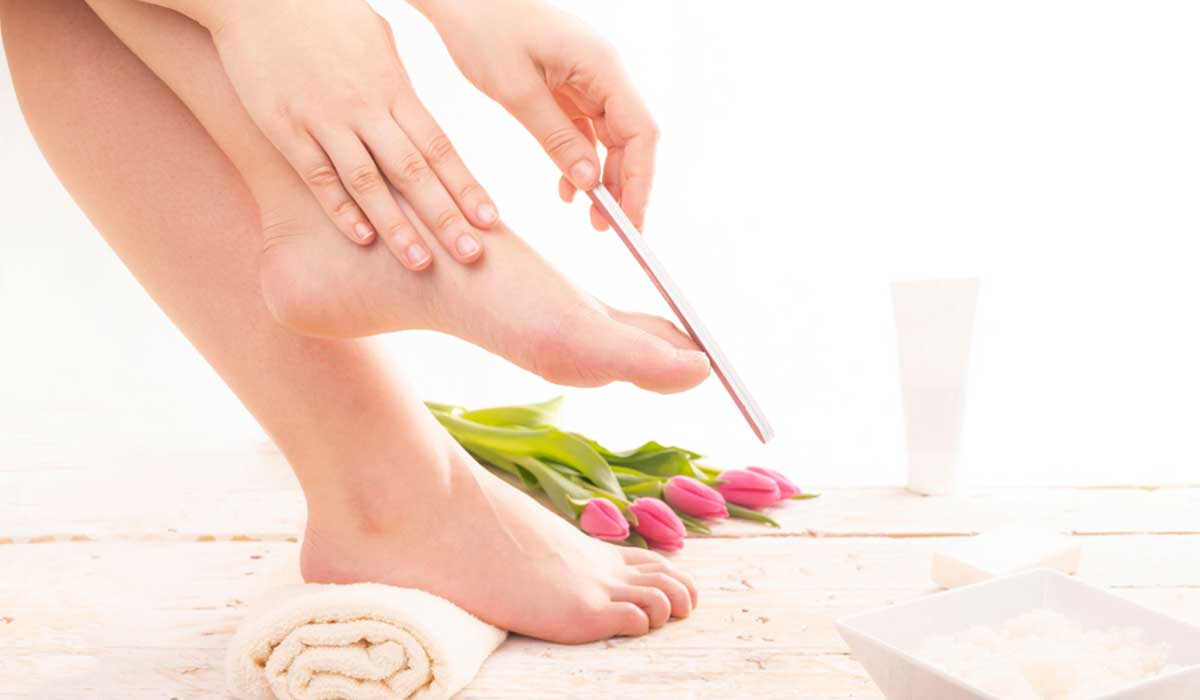 روتين تجميلي وعلاجي للقدمين، يهدف لتنظيف، تقشير، وترطيب الجلد وإزالة الجلد الميت (خاصة بالكعبين) باستخدام أدوات مثل حجر الخفاف